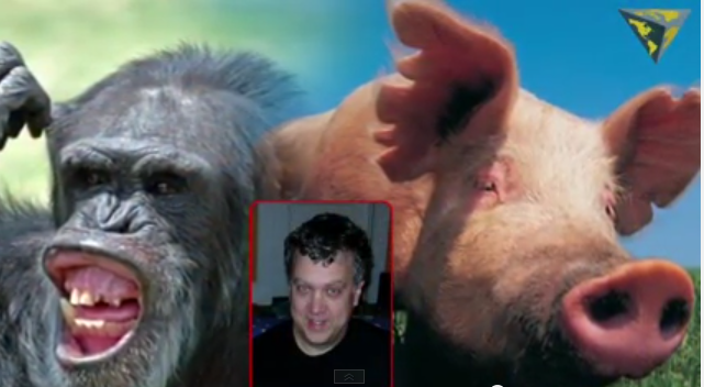 The human species began as the hybrid offspring of a male pig and a female chimpanzee, an American geneticist has suggested.